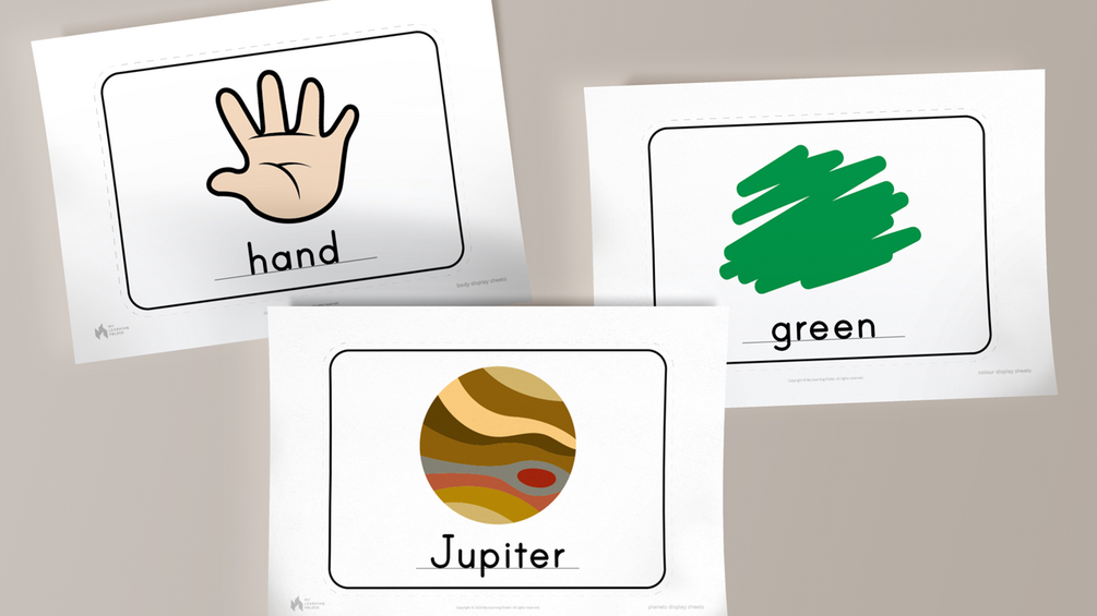 You'll get printable display cards for colours, parts of the body and planets in a compressed file.